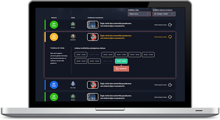 Ērts, viegli uztevams un mūsdienīgi veidots iekšējais kalendārs ar iespēju izvēlēties pieejamos datumus, laikus, cilvēku skaitu utt. Ātrs pieteikums un apmaksa sasaistē ar Bookla rezervācijas sistēmu, biļešu iegādei.